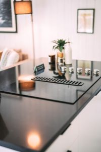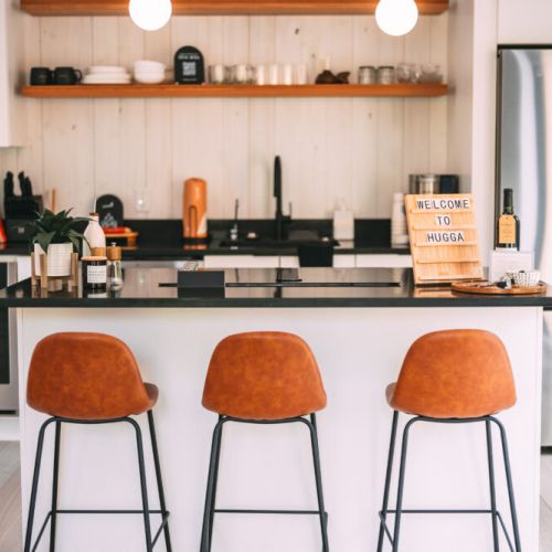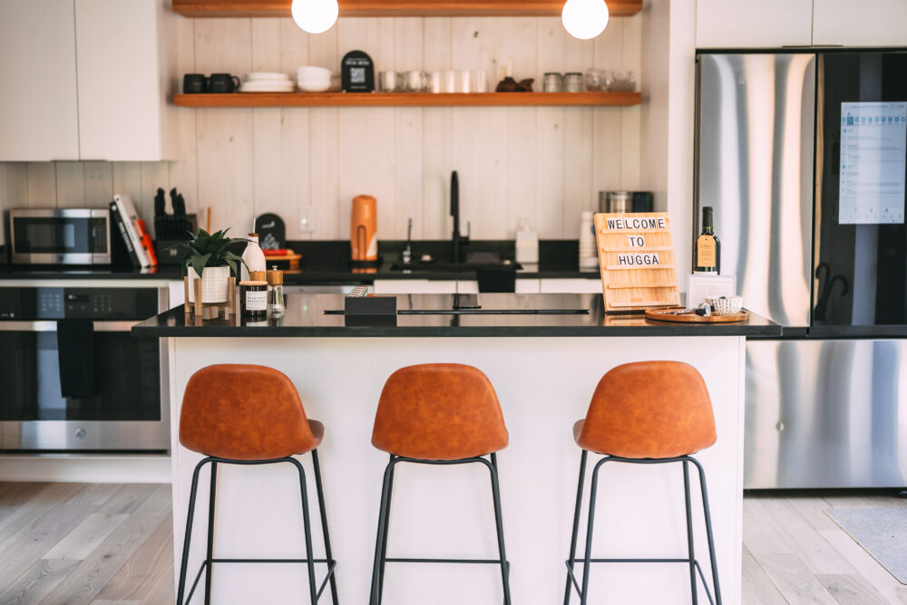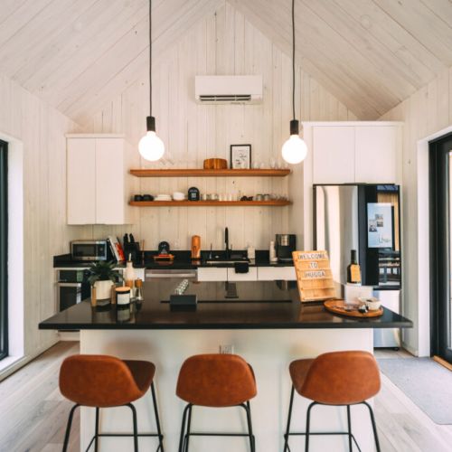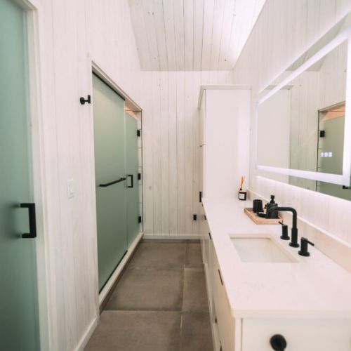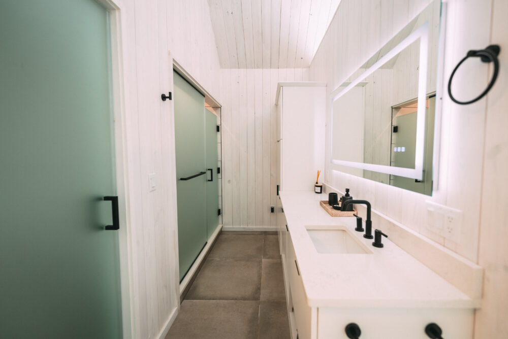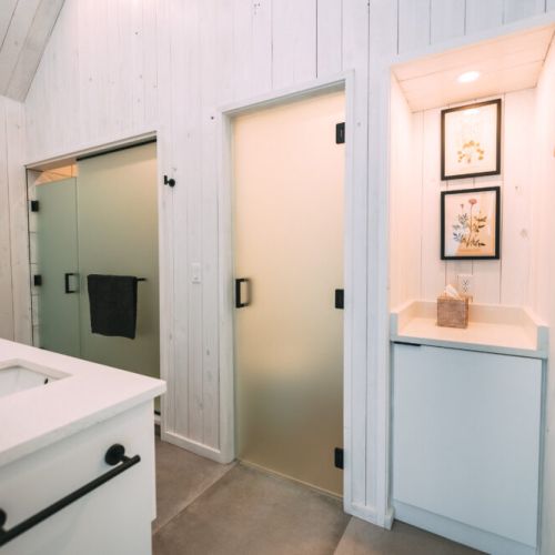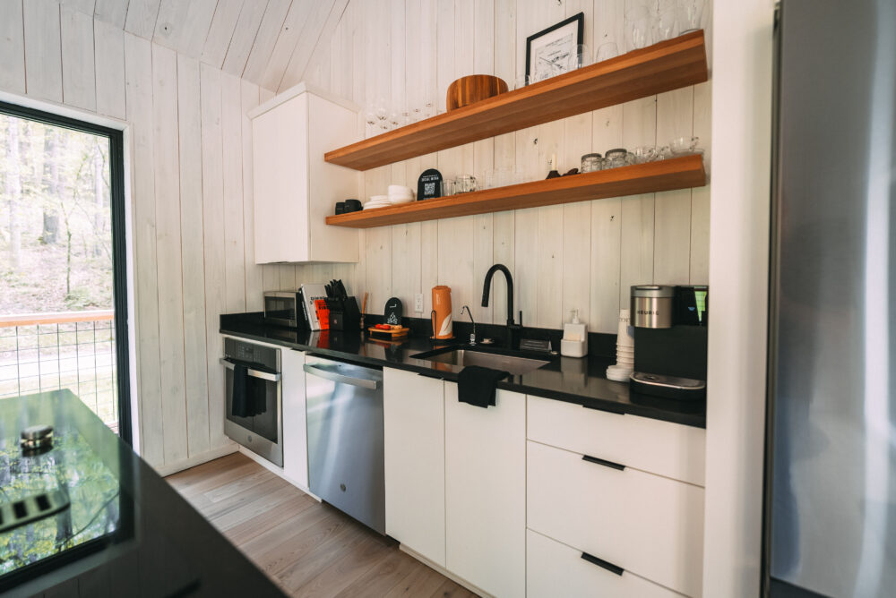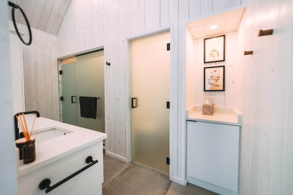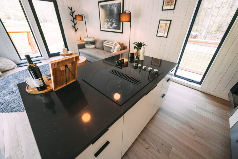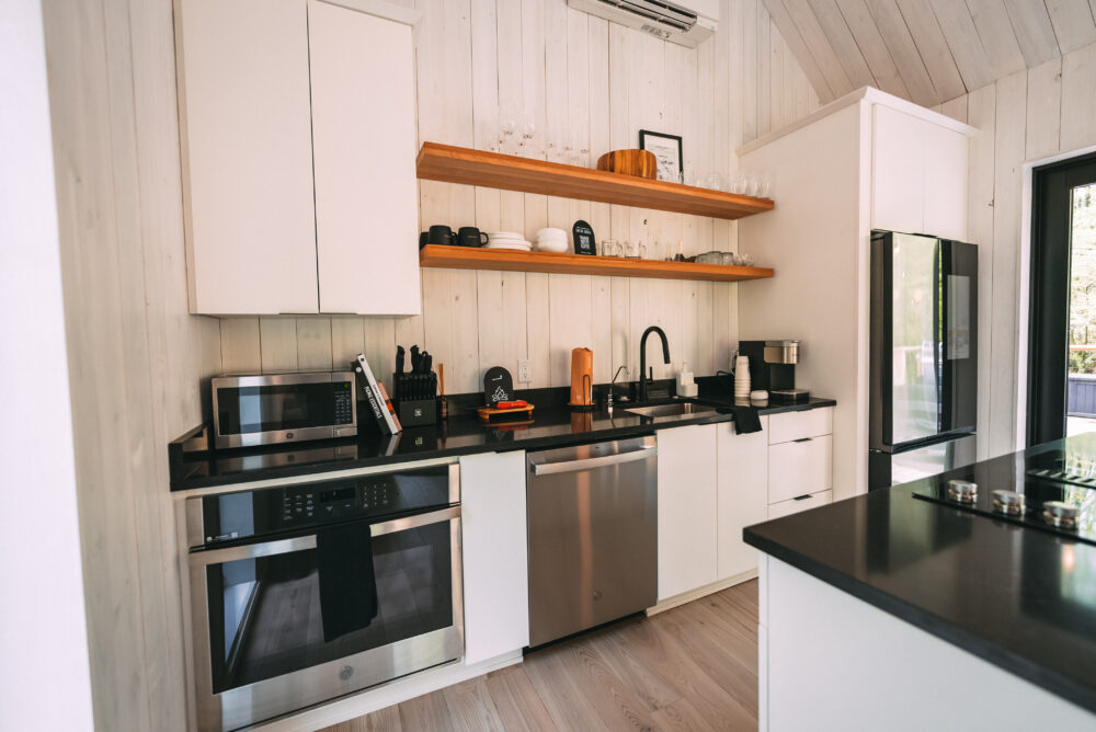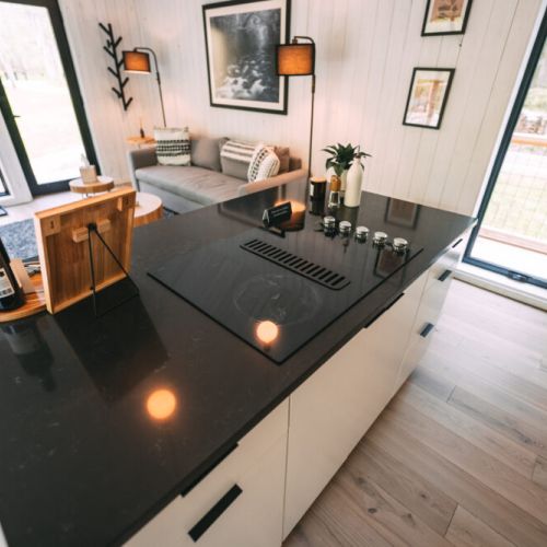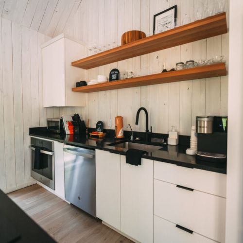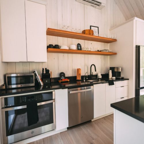 The modern, yet unique design of this tiny villa space allows it to not feel “tiny” and the full kitchen takes advantage of this layout. High end appliances, countertops and cabinets line the kitchen while the elevated dining bar allows you to enjoy any meal!