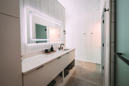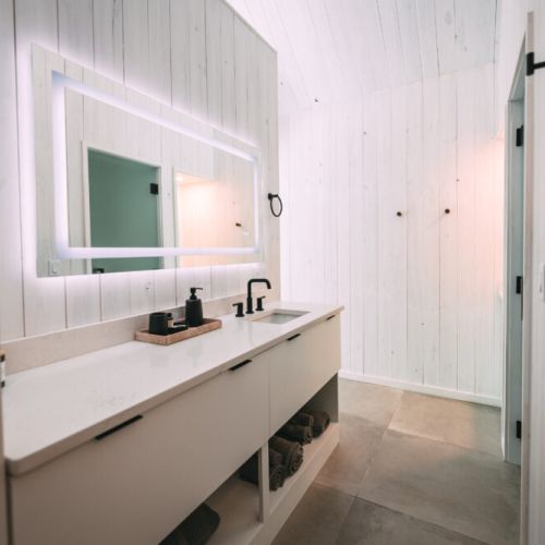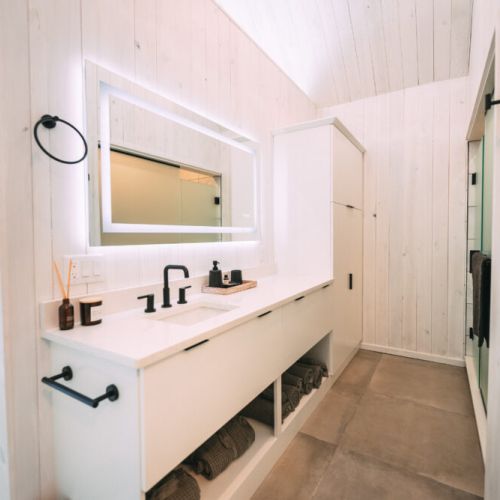 This gorgeous bathroom will make your skincare & hygiene routine feel even more luxurious. The large walk-in shower with tall ceilings elevates any bathroom experience.