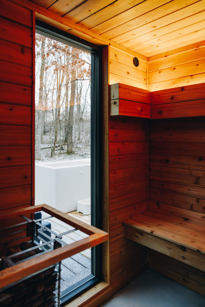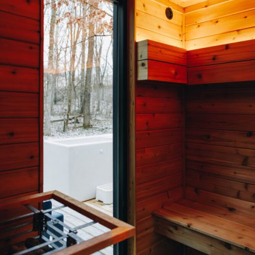 Each cabin features a private Scandinavian-style sauna and cold plunge for a true wellness experience.