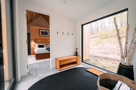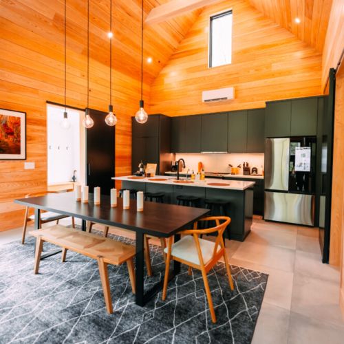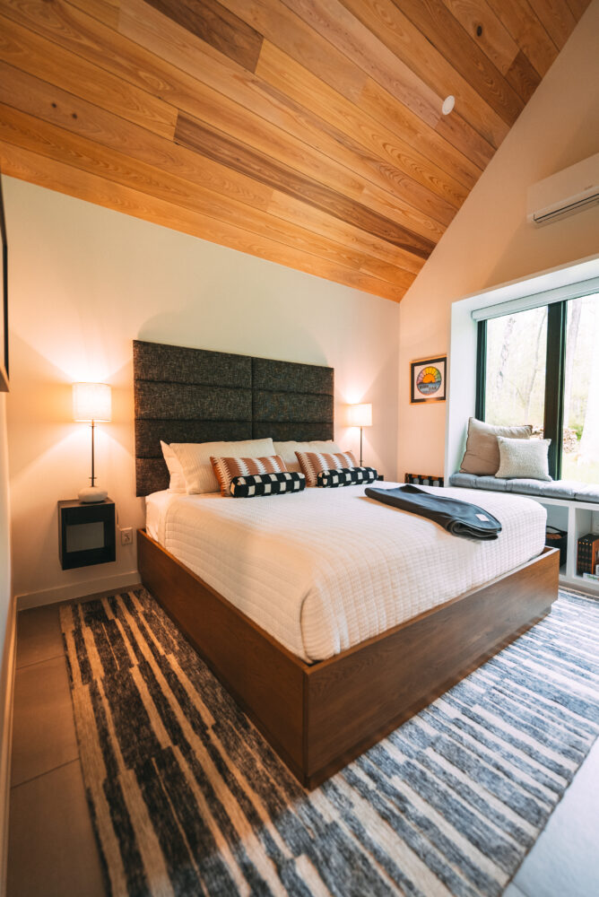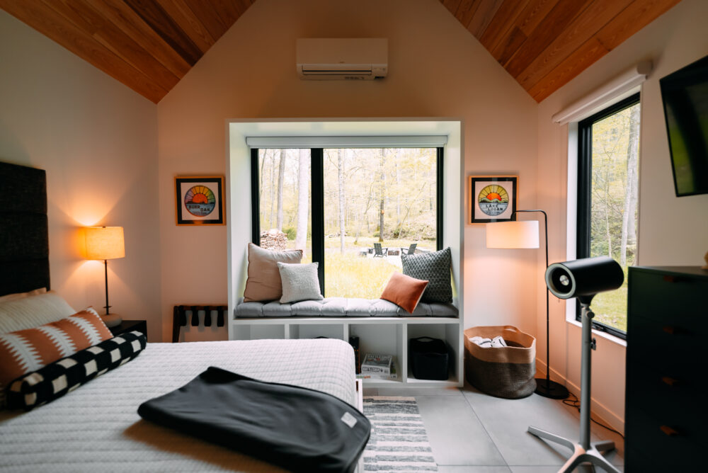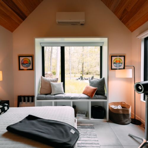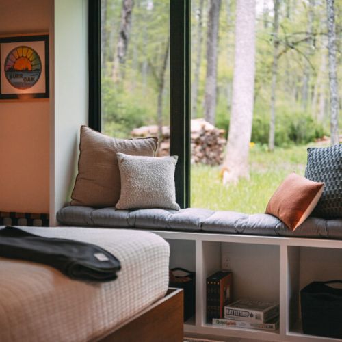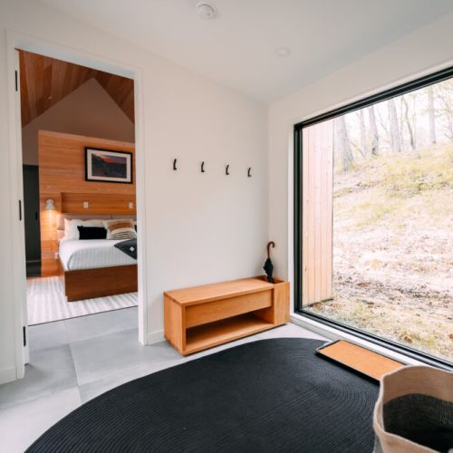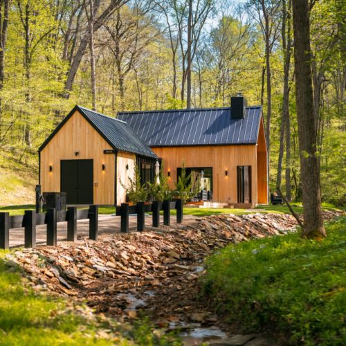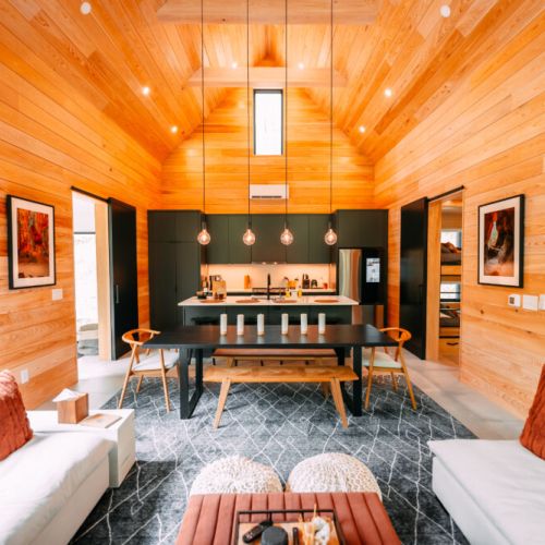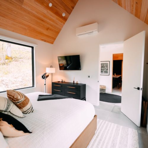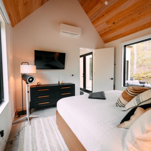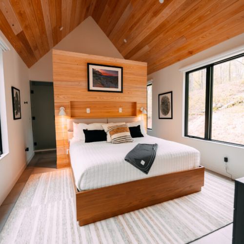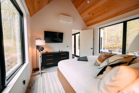 The cabin brings modern Scandinavian design into the middle of a 10-acre meadow on our 42-acre property. The two-bedroom, 2.5-bath layout is built around space, light, and simplicity. Every detail is designed to help you slow down and feel connected to the land.