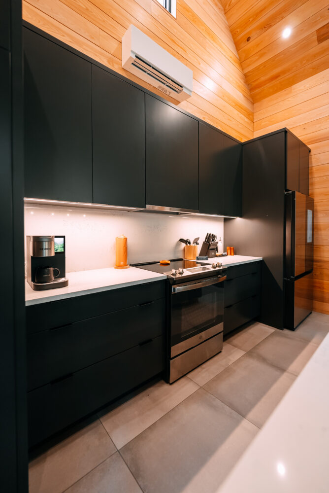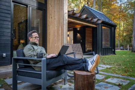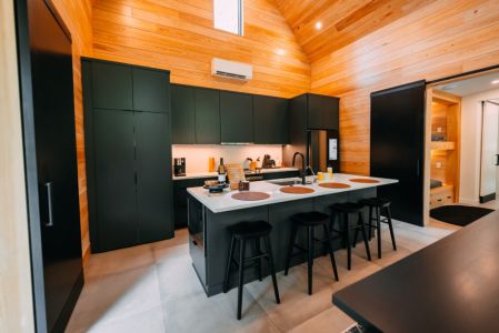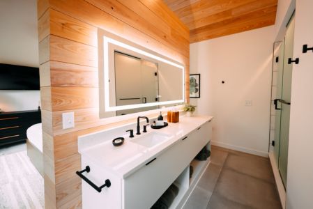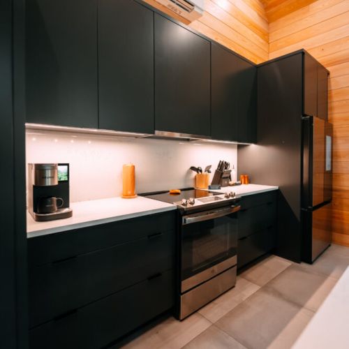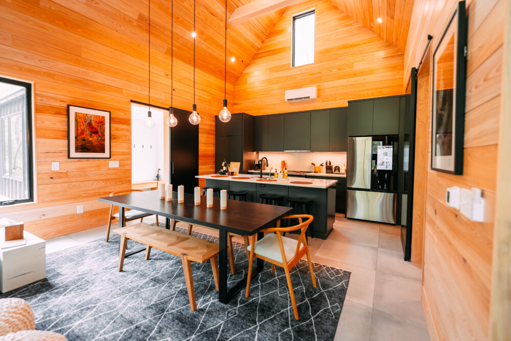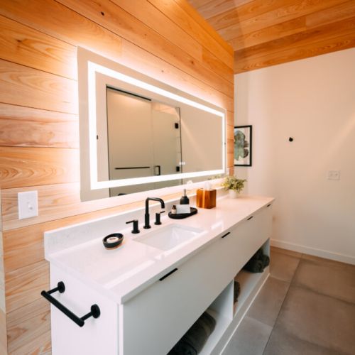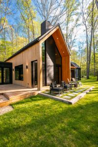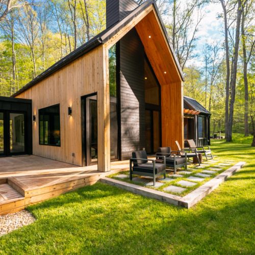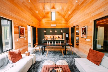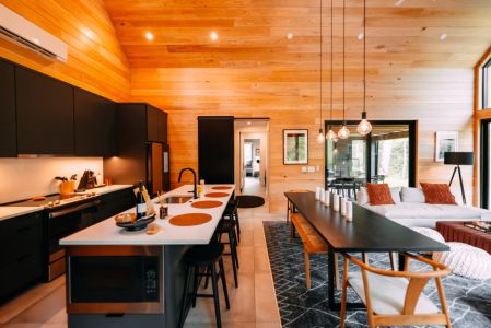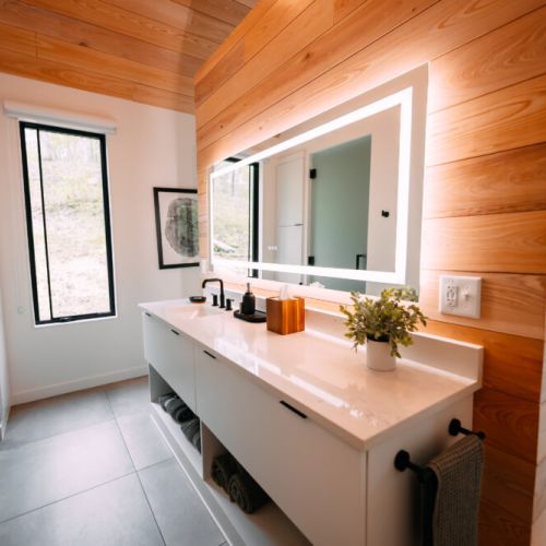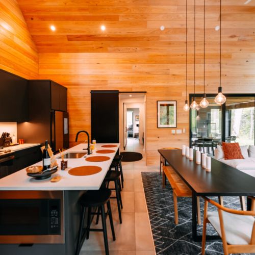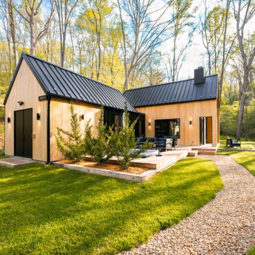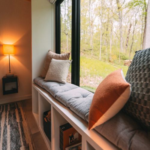 The cabin brings modern Scandinavian design into the middle of a 10-acre meadow on our 42-acre property. The two-bedroom, 2.5-bath layout is built around space, light, and simplicity. Every detail is designed to help you slow down and feel connected to the land.
