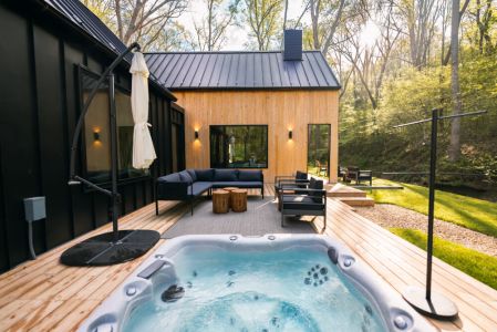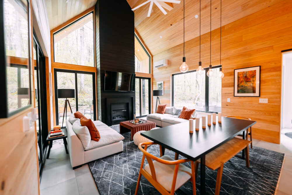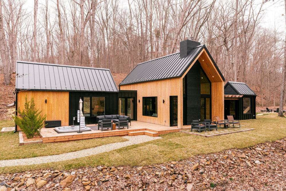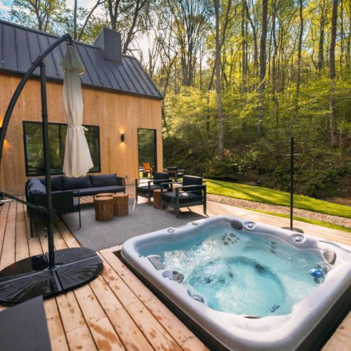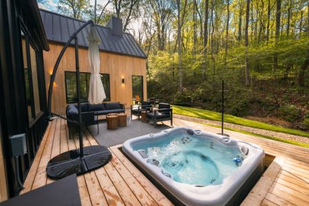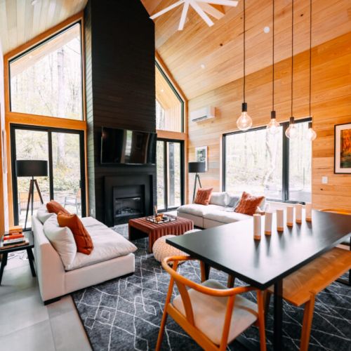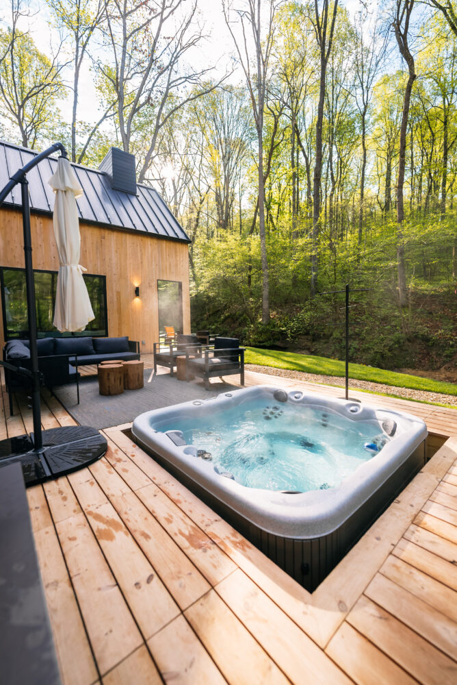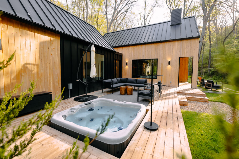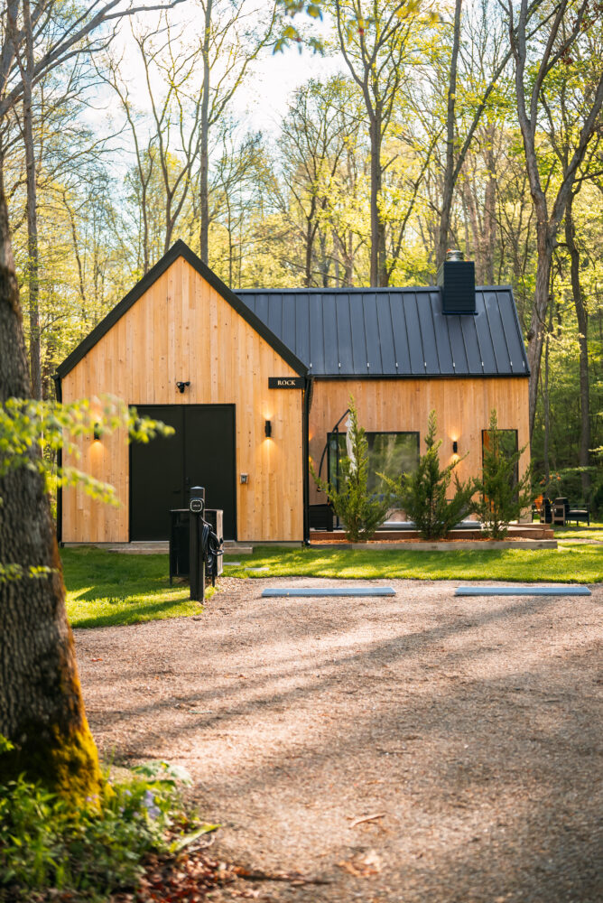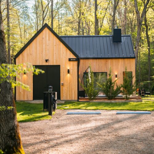 Hugga is a Scandinavian-inspired retreat on 42 wooded acres in Hocking Hills. Modern cabins feature minimalist design, private saunas, cold plunges, hot tubs, EV charging, and scenic trails.