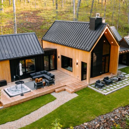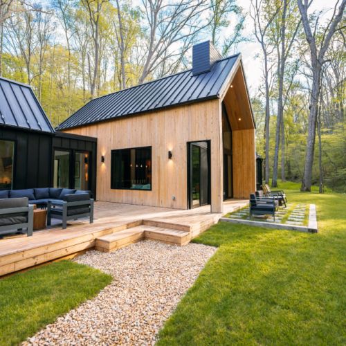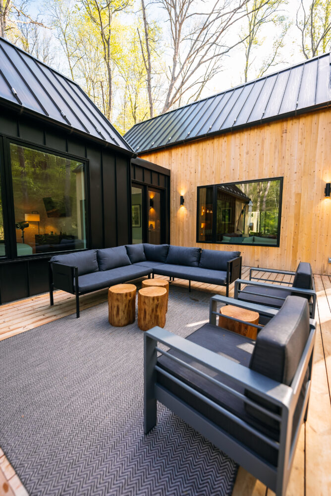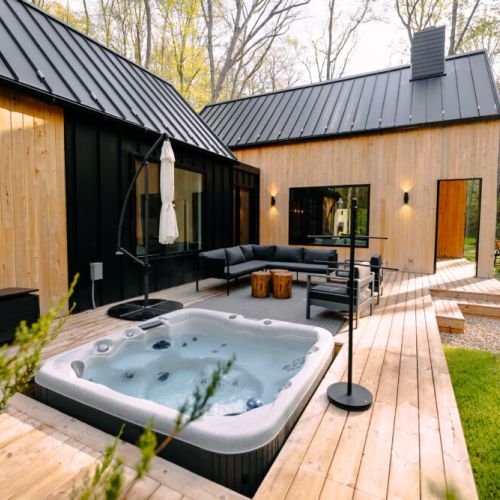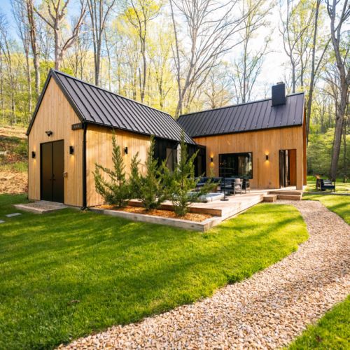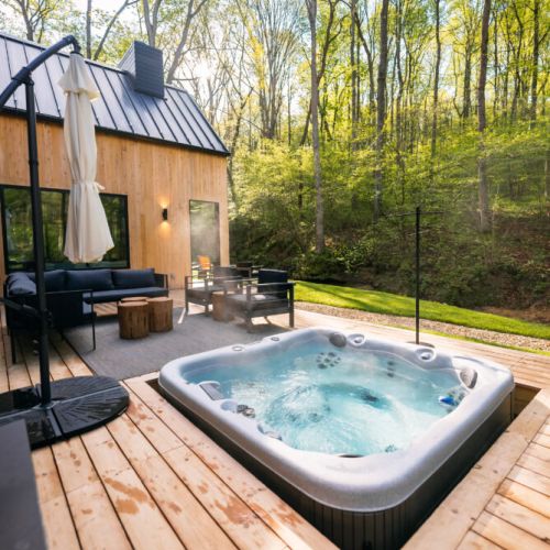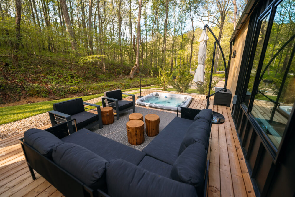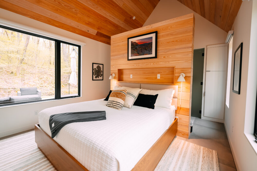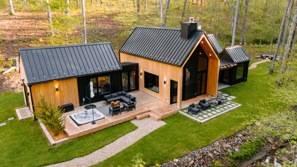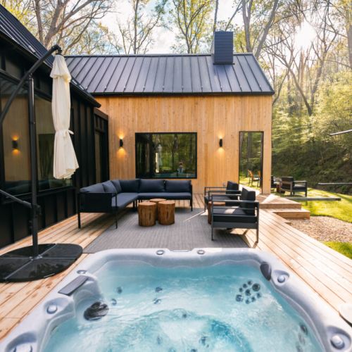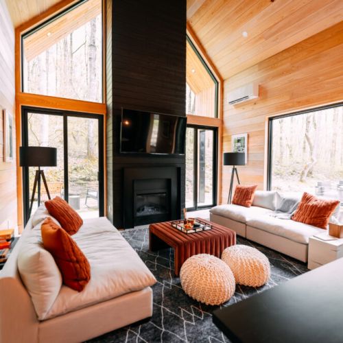 Hugga is a Scandinavian-inspired retreat on 42 wooded acres in Hocking Hills. Modern cabins feature minimalist design, private saunas, cold plunges, hot tubs, EV charging, and scenic trails.