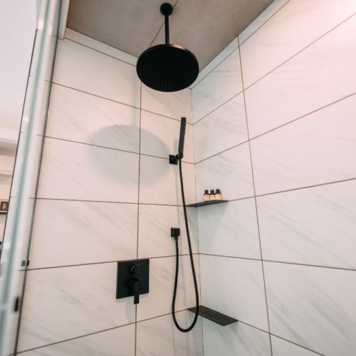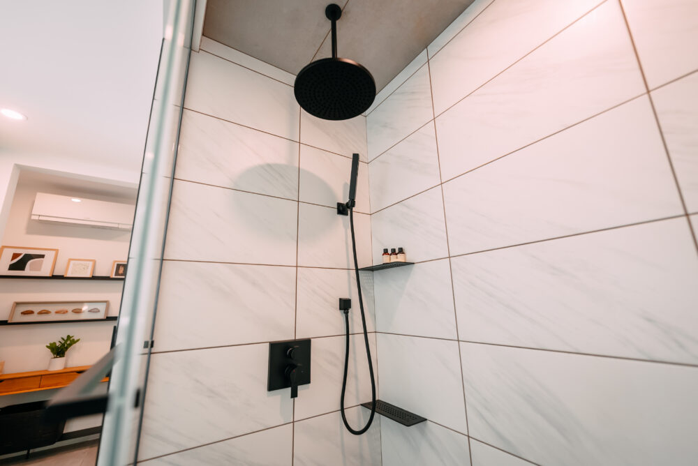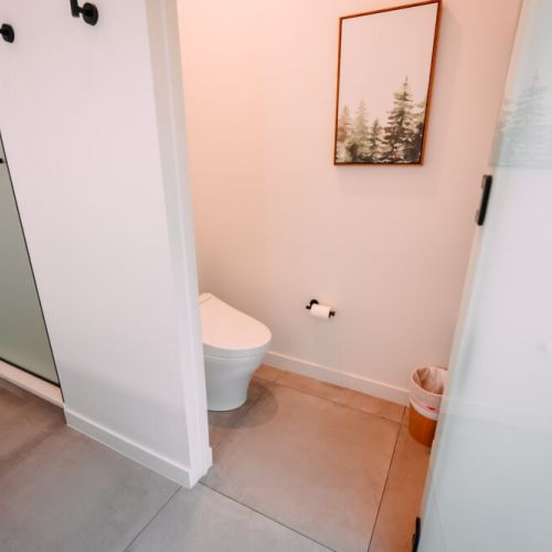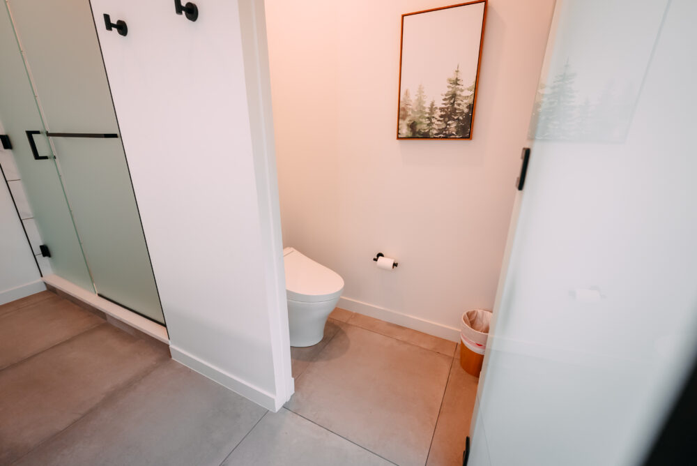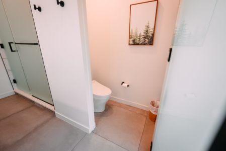 The primary bedroom features a king bed with soft linens and a calm, minimal design. The en-suite bathroom gives you a private place to reset. The second bedroom mirrors the same comfort and aesthetic, making it easy for everyone to rest well.