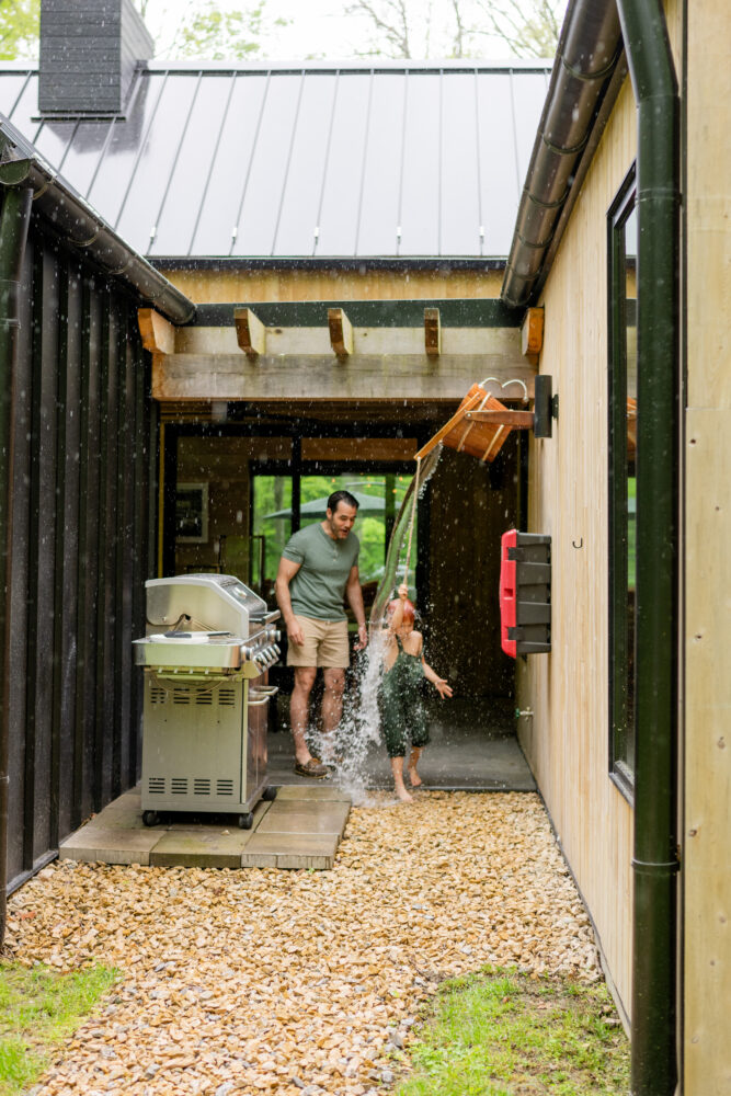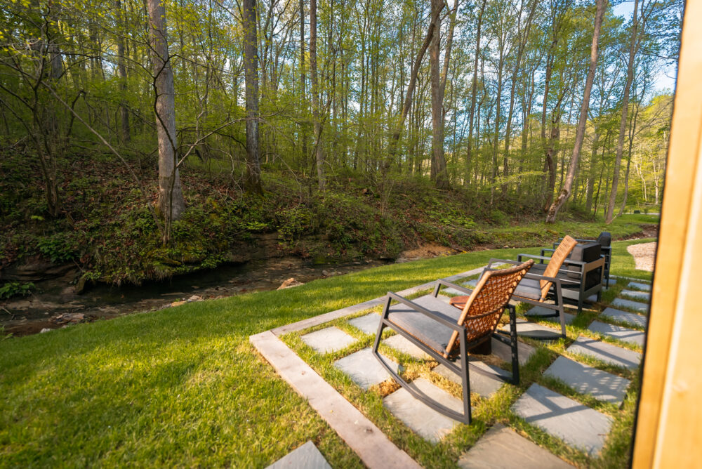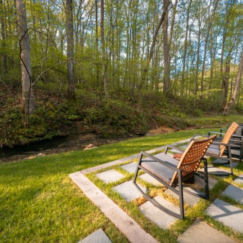 This cabin sits beside a rock face carved by a seasonal creek. Kids and adults both end up spending time down there—exploring the water, stacking stones, and building little dams. It’s one of those simple spots that pulls you in.
