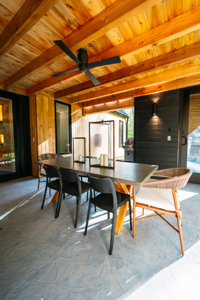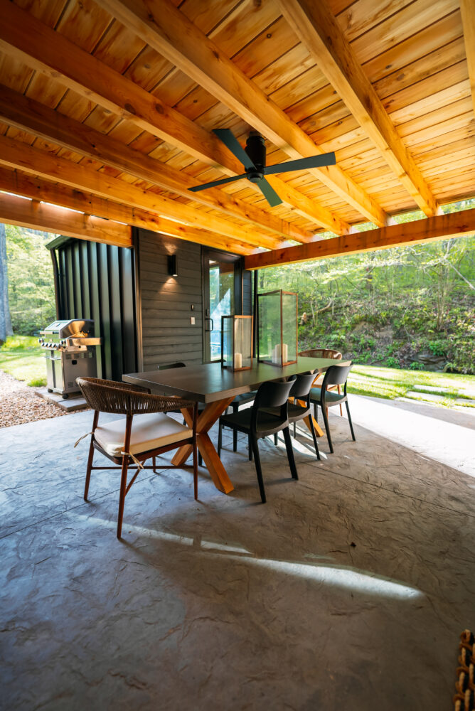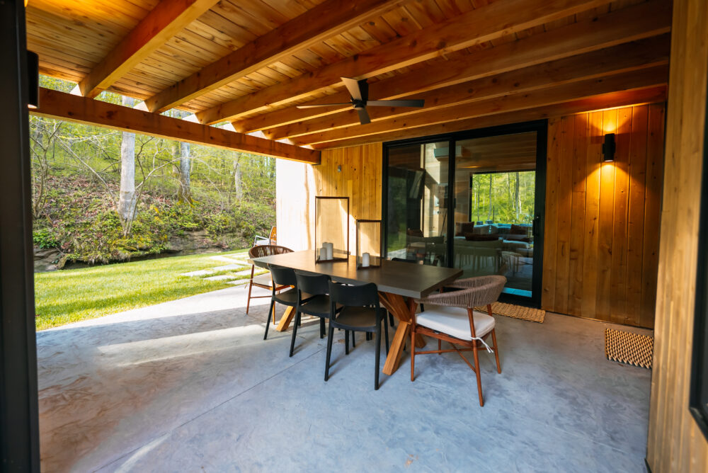 Glass doors lead to the outdoor patio, where mornings start with coffee and wide-open views, and evenings end under big, starry skies.